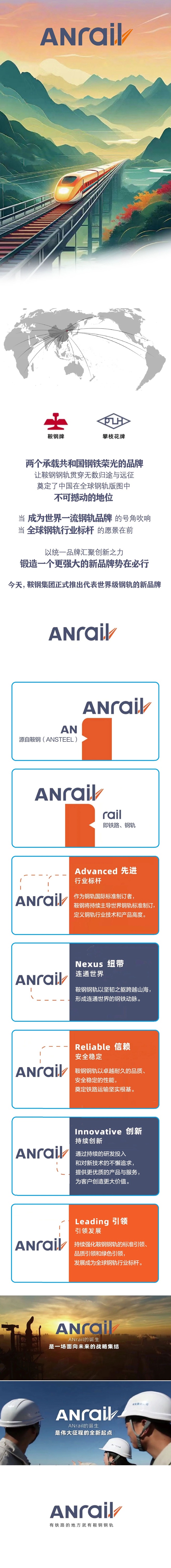 鞍鋼鋼軌品牌ANrail是鞍鋼集團錨定“打造享譽世界的鋼軌品牌”目標,整合旗下“鞍鋼”“攀枝花”兩大鋼軌品牌數十年淬煉的研發生產實力、全球資源和市場聲譽而創建的鞍鋼鋼軌統一品牌。“ANrail”中的“AN”取自鞍鋼英文名稱ANSTEEL,“rail”代表鋼軌,字母A、N、R、I、L分別代表Advanced(行業標桿)、Nexus(連通世界)、Reliable(值得信賴)、Innovative(持續創新)、Leading(引領發展)。
