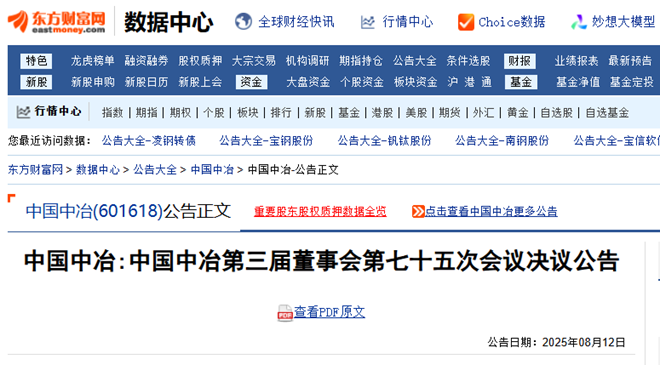 8月12日,中國中冶發布了《中國冶金科工股份有限公司第三屆董事會第七十五次會議決議公告》(以下簡稱《公告》)。