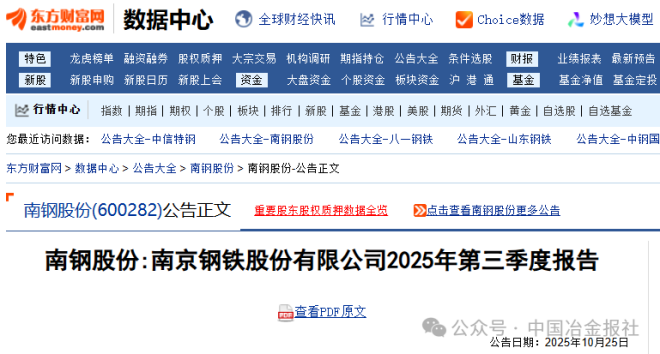10月25日,南鋼股份發布《南京鋼鐵股份有限公司2025年第三季度報告》。