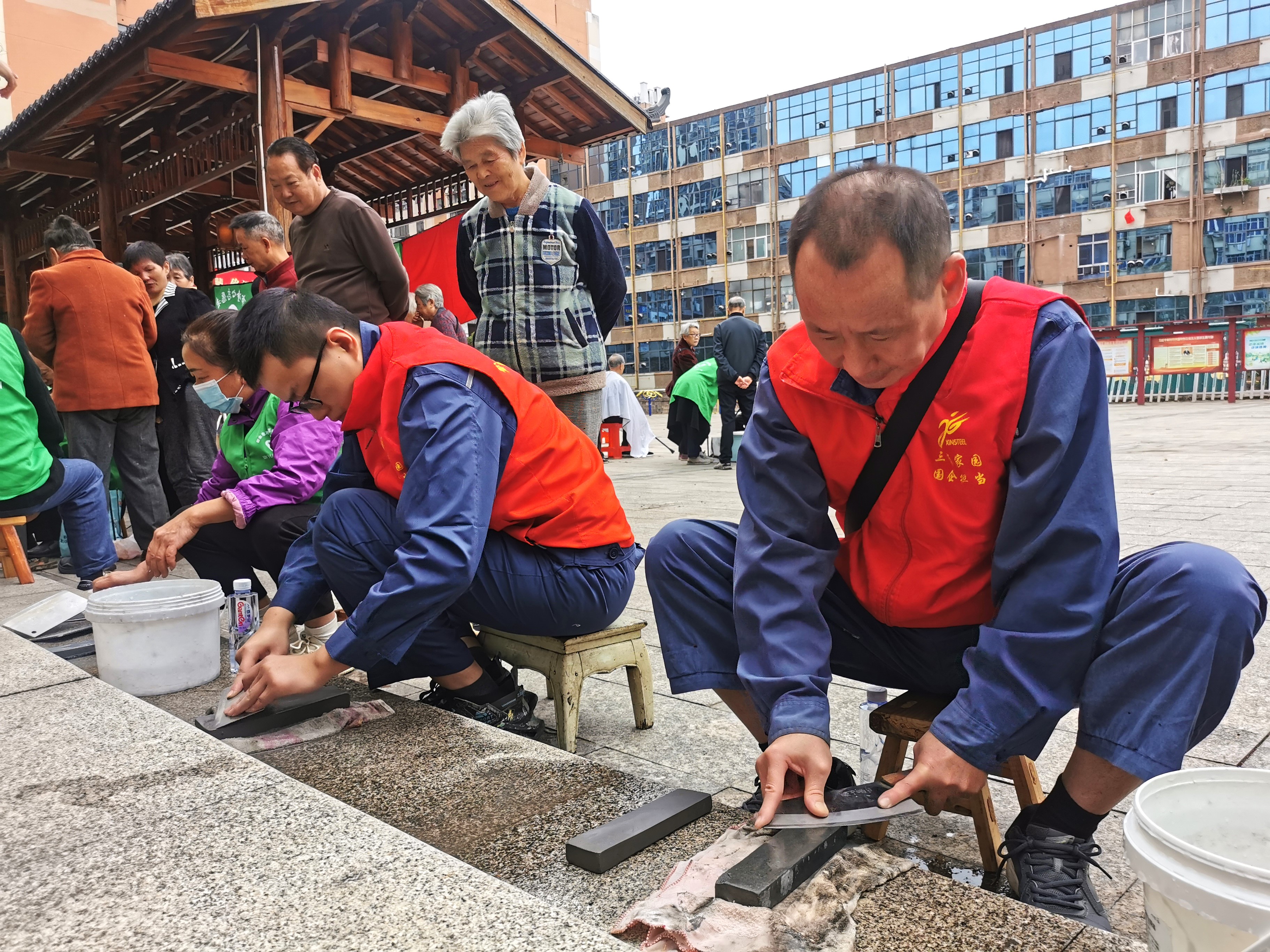 這群“紅馬甲”是廖小根、龔軍輝、桂云剛。他們是中國寶武新鋼集團(tuán)技術(shù)中心原料檢驗(yàn)作業(yè)區(qū)黨員和一線骨干。他們積極響應(yīng)技術(shù)中心原料檢驗(yàn)作業(yè)區(qū)黨支部的號(hào)召,主動(dòng)與新余市凈心志愿者協(xié)會(huì)隊(duì)員們攜手,走進(jìn)新鋼文化村下抱南廣場(chǎng)開展了一場(chǎng)“愛在初冬 暖心社區(qū)”志愿者服務(wù)活動(dòng),以實(shí)際行動(dòng)奉獻(xiàn)愛心、傳遞溫暖。這一天,正是他們的休息日,“利用節(jié)假日發(fā)揮一技之長(zhǎng)參加了理發(fā)、磨刀服務(wù)項(xiàng)目,是一件很快樂的事。”黨員廖小根說道。