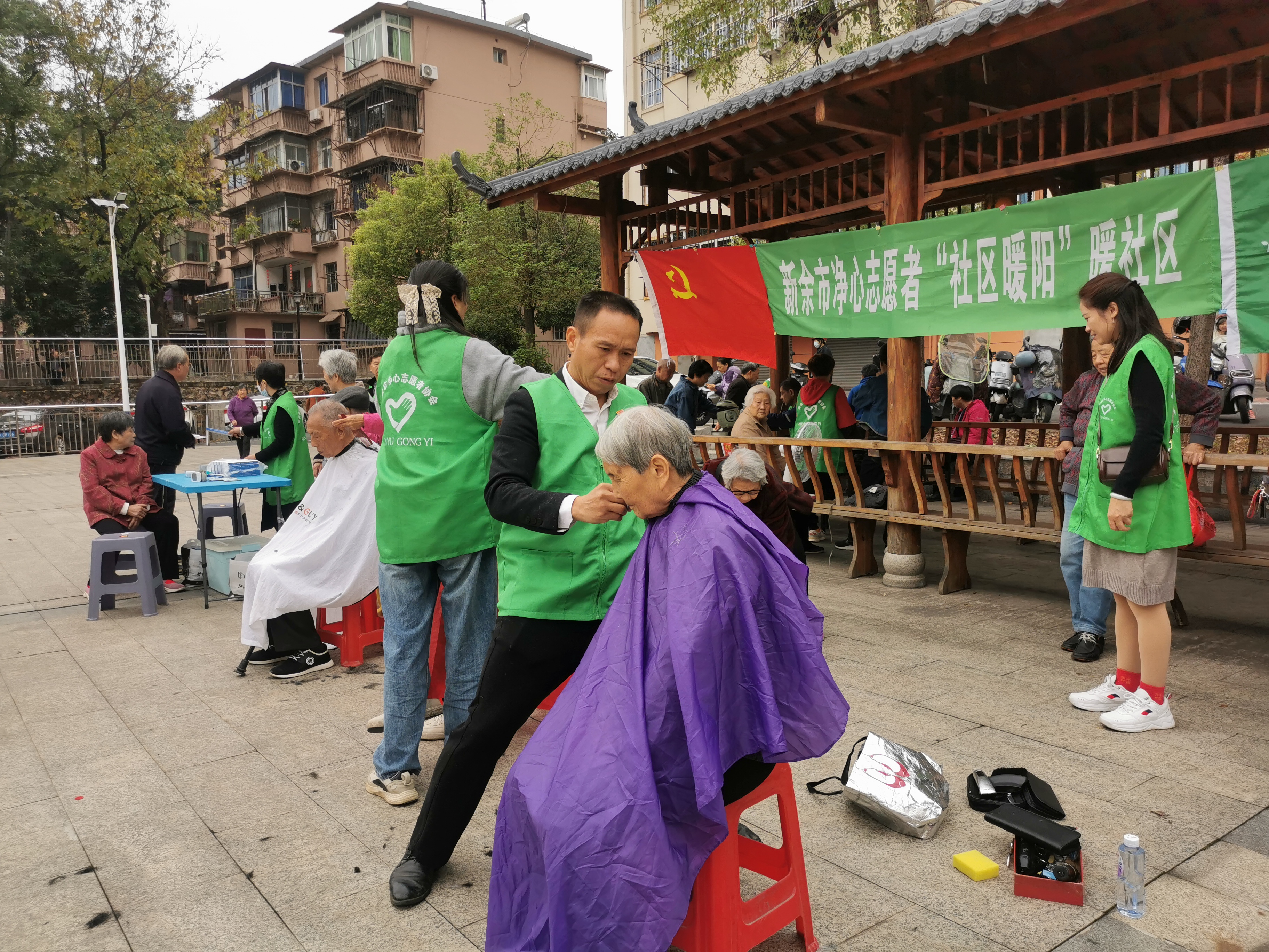 初冬的鋼城,處處有暖意。11月13日九時(shí)許,在新鋼文化社區(qū)廣場(chǎng)上黨旗飄揚(yáng),人頭攢動(dòng),一群身著紅馬甲的志愿者,用靈巧的雙手,熱忱地為居民朋友們理發(fā)、磨刀、修理小家電、忙得不亦樂乎。