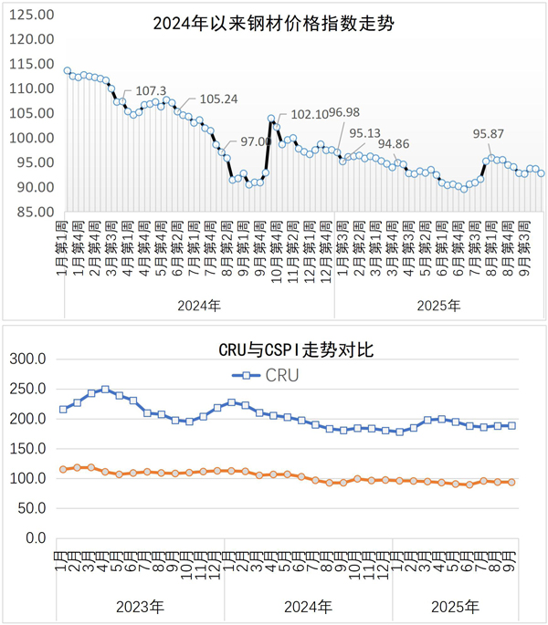 當周,中國鋼材價格指數(CSPI)為92.71點,周環比下降0.93點,降幅為0.99%;比去年底下降4.76點,降幅為4.88%;同比下降11.18點,降幅為10.76%。其中,長材價格指數為92.89點,周環比下降1.27點,降幅為1.35%;比去年底下降7.33點,降幅為7.31%;同比下降16.02點,降幅為14.72%。板材價格指數為92.07點,周環比下降0.76點,降幅為0.81%;比去年底下降3.48點,降幅為3.64%;同比下降8.39點,降幅為8.35%。