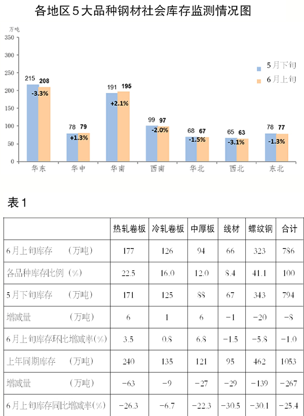 6月上旬,分地區(qū)來看,7大區(qū)域鋼材社會庫存各有升降,其中華東地區(qū)為庫存減量和降幅最大地區(qū)。具體情況見右圖。