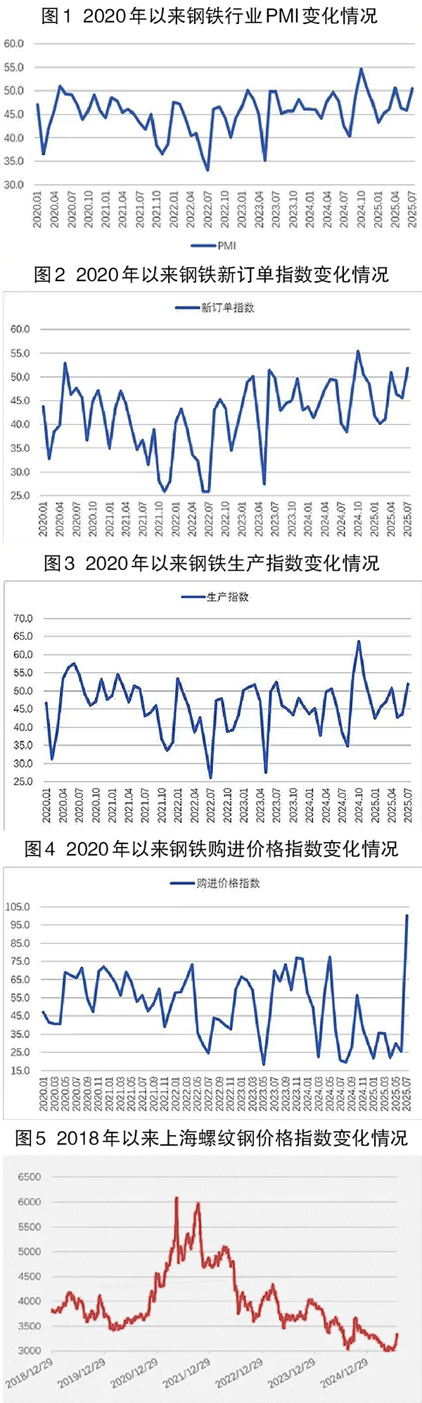 7月份,從需求端看,雖然高溫多雨等天氣對戶外施工有一定影響,但政策端刺激效應(yīng)釋放,市場情緒趨于積極,鋼鐵市場需求有所回升,新訂單指數(shù)反彈至擴(kuò)張區(qū)間,創(chuàng)階段性新高。從供給端看,隨需求同步恢復(fù),生產(chǎn)活動明顯回暖,鋼廠粗鋼產(chǎn)量環(huán)比回升。原材料端價(jià)格體系走強(qiáng),鐵礦石、焦炭受采購放量及供應(yīng)擾動影響普遍回升,購進(jìn)價(jià)格指數(shù)結(jié)束長期低位運(yùn)行;鋼材價(jià)格同步上行,7月份上漲明顯。行業(yè)信心有所增強(qiáng),生產(chǎn)經(jīng)營活動預(yù)期指數(shù)回升至擴(kuò)張區(qū)間。