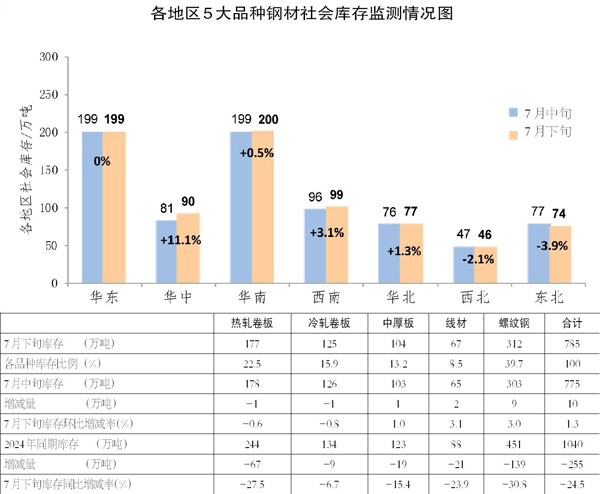 7月下旬,分地區來看,7大區域鋼材社會庫存環比各有升降,其中西北地區、東北地區的庫存環比繼續下降;華東地區的庫存持平;其他地區均有所上升。其中,華中地區為增量和升幅最大地區,具體情況見下圖。
