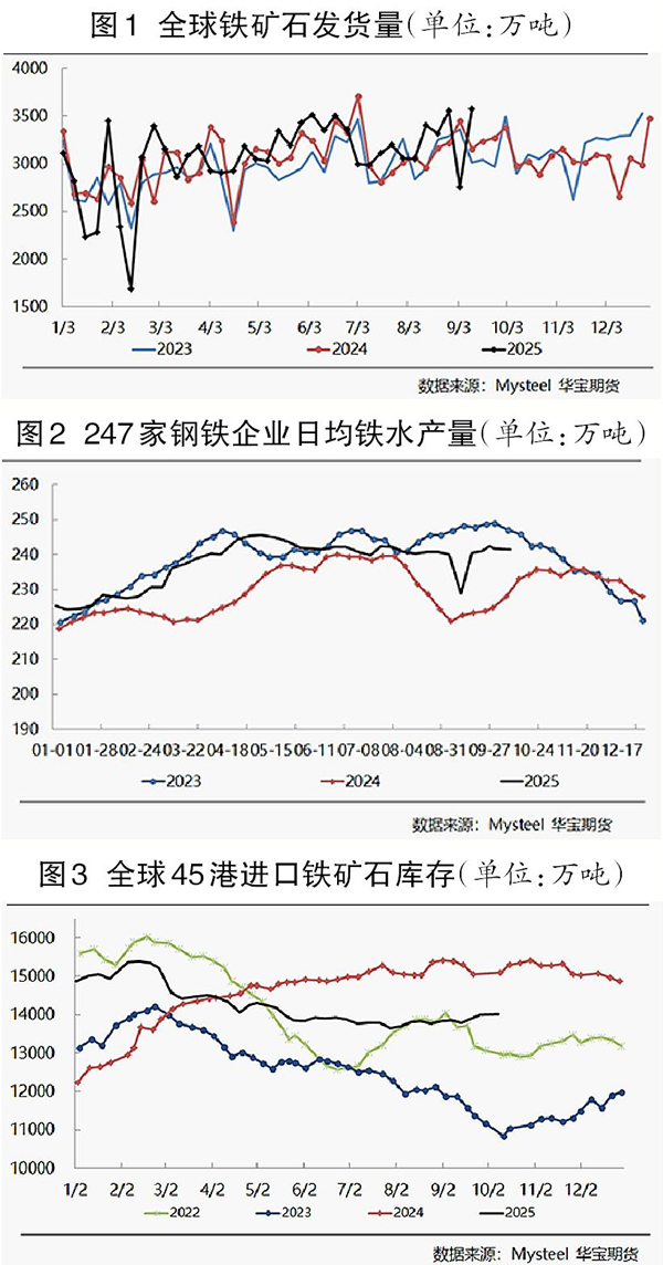 庫存方面,根據當前到港量及疏港量水平推算,10月份港口庫存累庫壓力偏小。第3季度供需兩旺,港口庫存環比回升,前3個季度鋼廠進口礦庫存水平略低于去年同期,鋼廠端延續低庫存管理策略。預估2025年第4季度45港港口庫存與第3季度末基本持平,整體較去年年末庫存下降850萬噸。