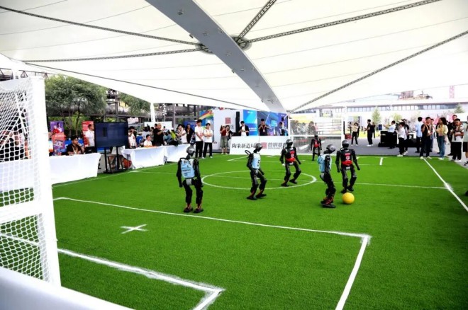 9月10日,人形機(jī)器人進(jìn)行3V3足球比賽