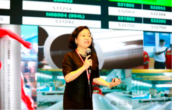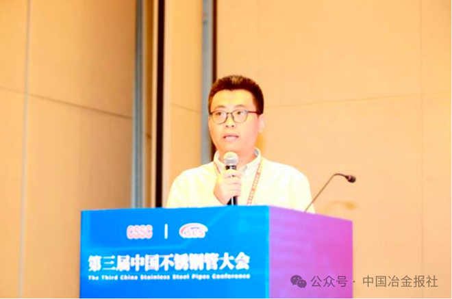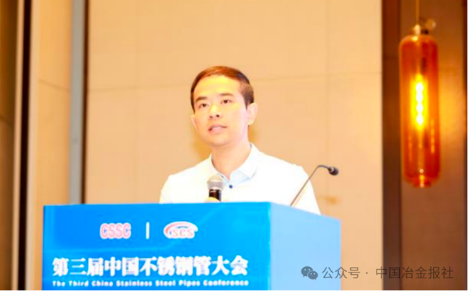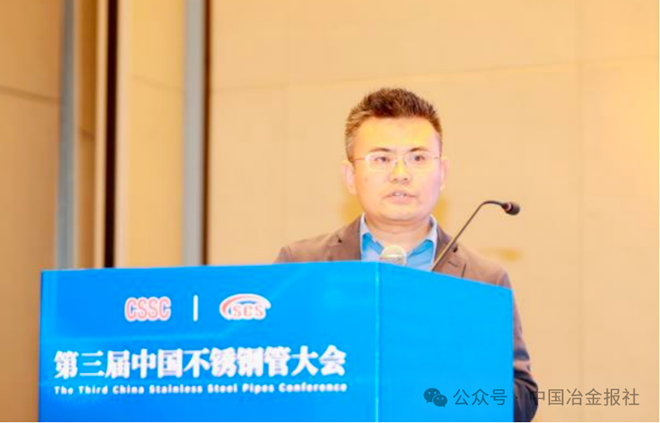圖為中國寶武太鋼不銹高級工程師、品質部部長王伯文做題為《新能源產(chǎn)業(yè)用鐵鎳基合金管材關鍵技術研究及應用》的主旨報告