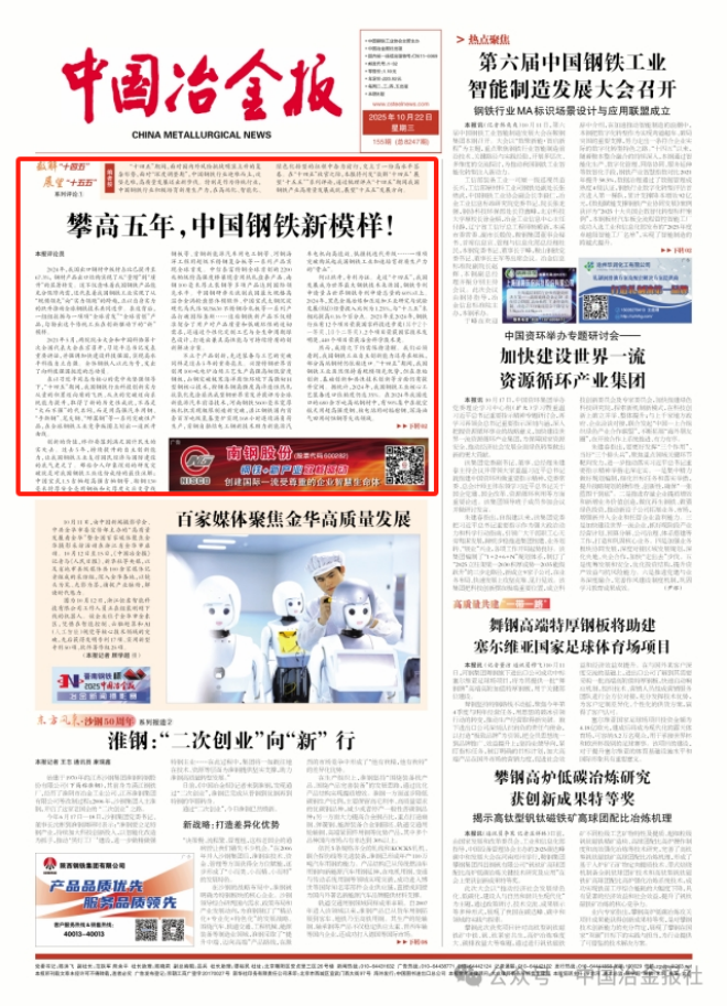 “十四五”的中國鋼鐵工業在科技創新這一頁上寫下了厚重的注腳。即將邁入“十五五”,中國鋼鐵工業仍要以創新為爐、以奮斗為火,淬煉出更多“國之重器”,在全球產業變革浪潮中挺立起鋼鐵脊梁,讓“中國鋼鐵”成為世界工業舞臺上最亮的名片!