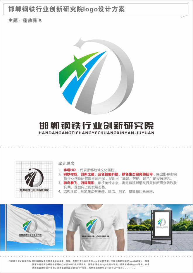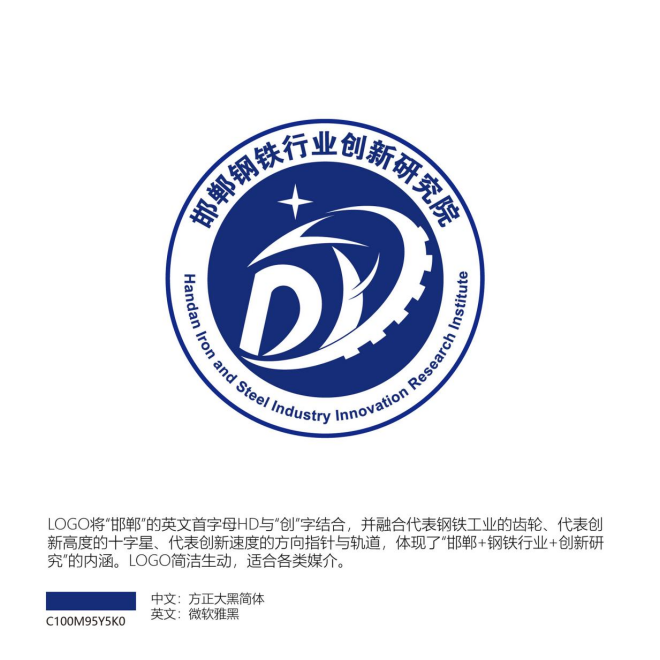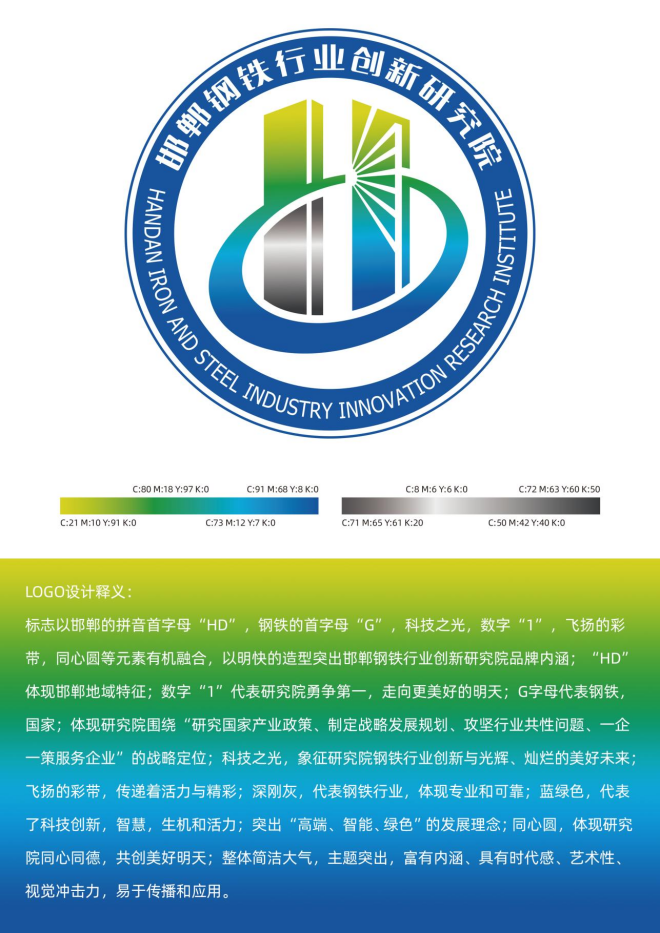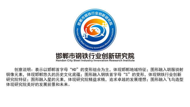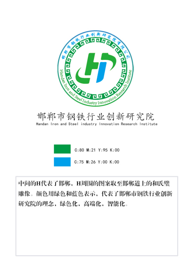 創意說明:中間的H代表古都邯鄲,H周圍的圖案取自戰國時期青銅器紋樣代表冶金歷史悠久。顏色用綠色和藍色表示,代表了邯鄲市鋼鐵行業創新研究院的理念,綠色化,高端化,智能化。