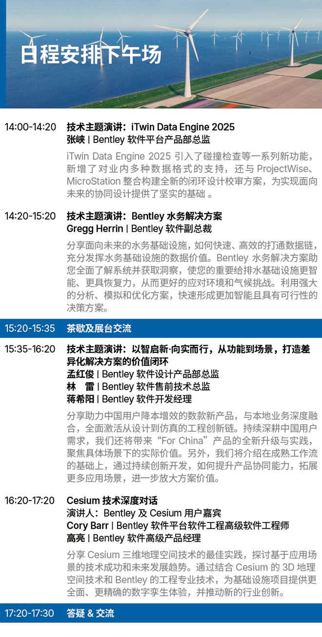 與Bentley及行業內決策者和技術專家面對面,了解我們如何通過創新、可持續性和卓越性能,推動基礎設施領域的未來發展。