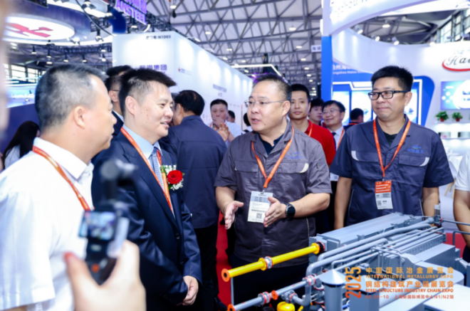 圖為中國(guó)鋼鐵工業(yè)協(xié)會(huì)黨委副書(shū)記、副會(huì)長(zhǎng)兼秘書(shū)長(zhǎng)姜維參觀展臺(tái)