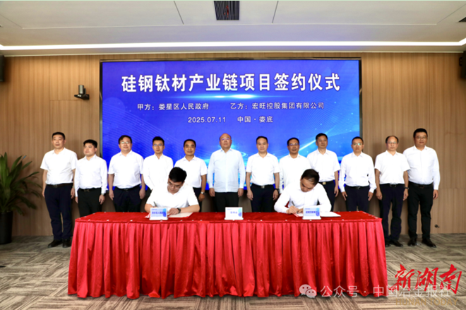 7月11日,婁星區(qū)人民政府與宏旺控股集團(tuán)簽約硅鋼鈦材產(chǎn)業(yè)鏈項(xiàng)目