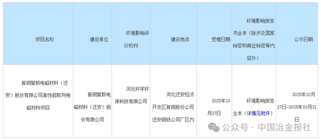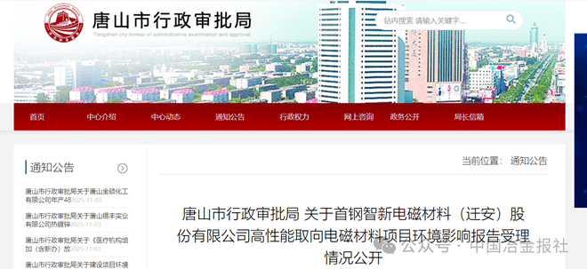 10月27日,唐山市行政審批局網站發布關于首鋼智新電磁材料(遷安)股份有限公司高性能取向電磁材料項目環境影響報告受理情況公開。