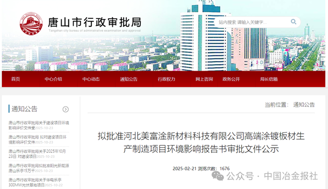 唐山市行政審批局于2025年2月21日發布的公示信息,河北美富淦新材料科技有限公司高端涂鍍板材生產制造項目已進入環評擬批準階段。該項目位于河北樂亭經濟開發區,具體位置東至樂亭新區建設投資有限公司、南至黃海路、西至營口道、北至渤海路。項目總投資34.5億元,其中環保投資達13360萬元,占比3.87%。項目建成后,年可生產高端冷軋板材、鍍錫卷、鍍鉻卷、退火卷、鍍鋅卷共130萬噸。