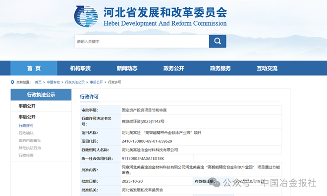 2025年10月20日,河北美富淦 “高智能精密合金彩涂產業園”項目,正式獲得河北省發展和改革委員會的節能審查批準。