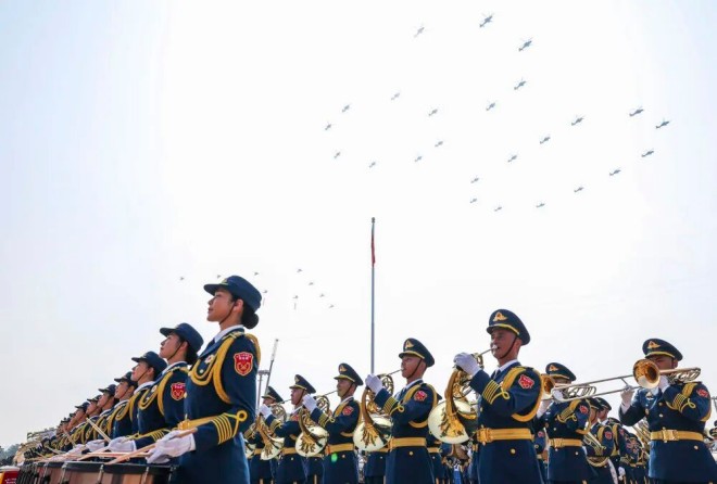 2025年9月3日,紀念中國人民抗日戰爭暨世界反法西斯戰爭勝利80周年大會在北京隆重舉行。這是中國人民解放軍聯合軍樂團和觀禮的嘉賓。新華社記者 鞠煥宗 攝