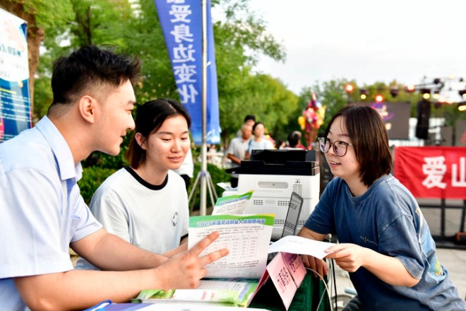 2025年8月25日,在山東省濱州市惠民縣孫武廣場,人社局的工作人員向市民介紹社保證明查詢相關服務。新華社記者 郭緒雷 攝