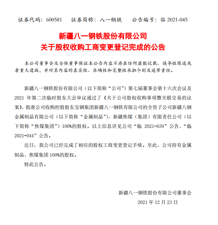 新疆八一鋼鐵股份有限公司關(guān)于股權(quán)收購(gòu)工商變更登記完成的公告