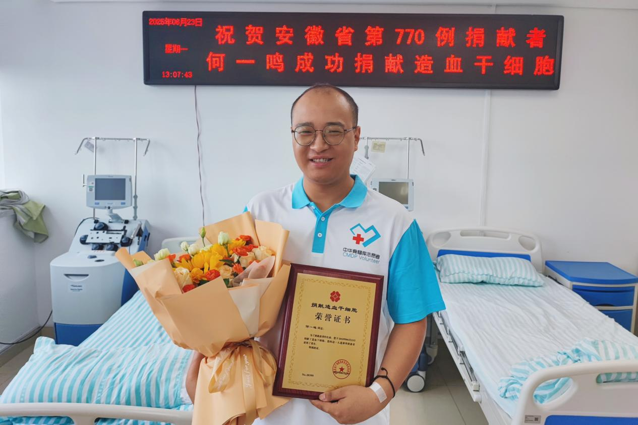 6月18日,何一鳴順利赴合肥入院,為造血干細(xì)胞捐獻(xiàn)做最后準(zhǔn)備。在完成為期5天9次的骨髓動員劑注射后,6月23日上午,他成功捐獻(xiàn)造血干細(xì)胞,成為中華骨髓庫第20399例,安徽省第770例,池州市貴池區(qū)第6例,上海寶冶鋼構(gòu)第1例非血緣造血干細(xì)胞捐獻(xiàn)者,為患者重燃生命之光。