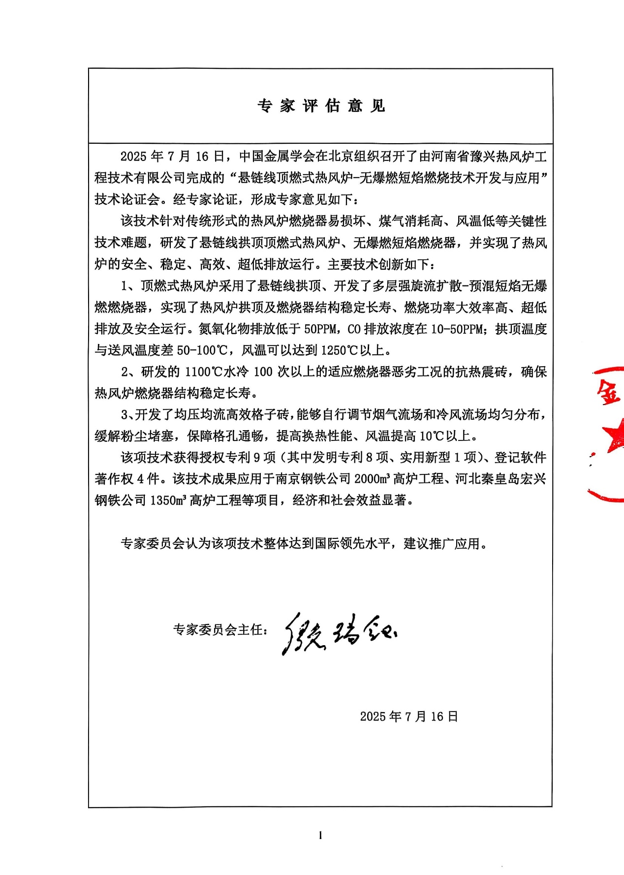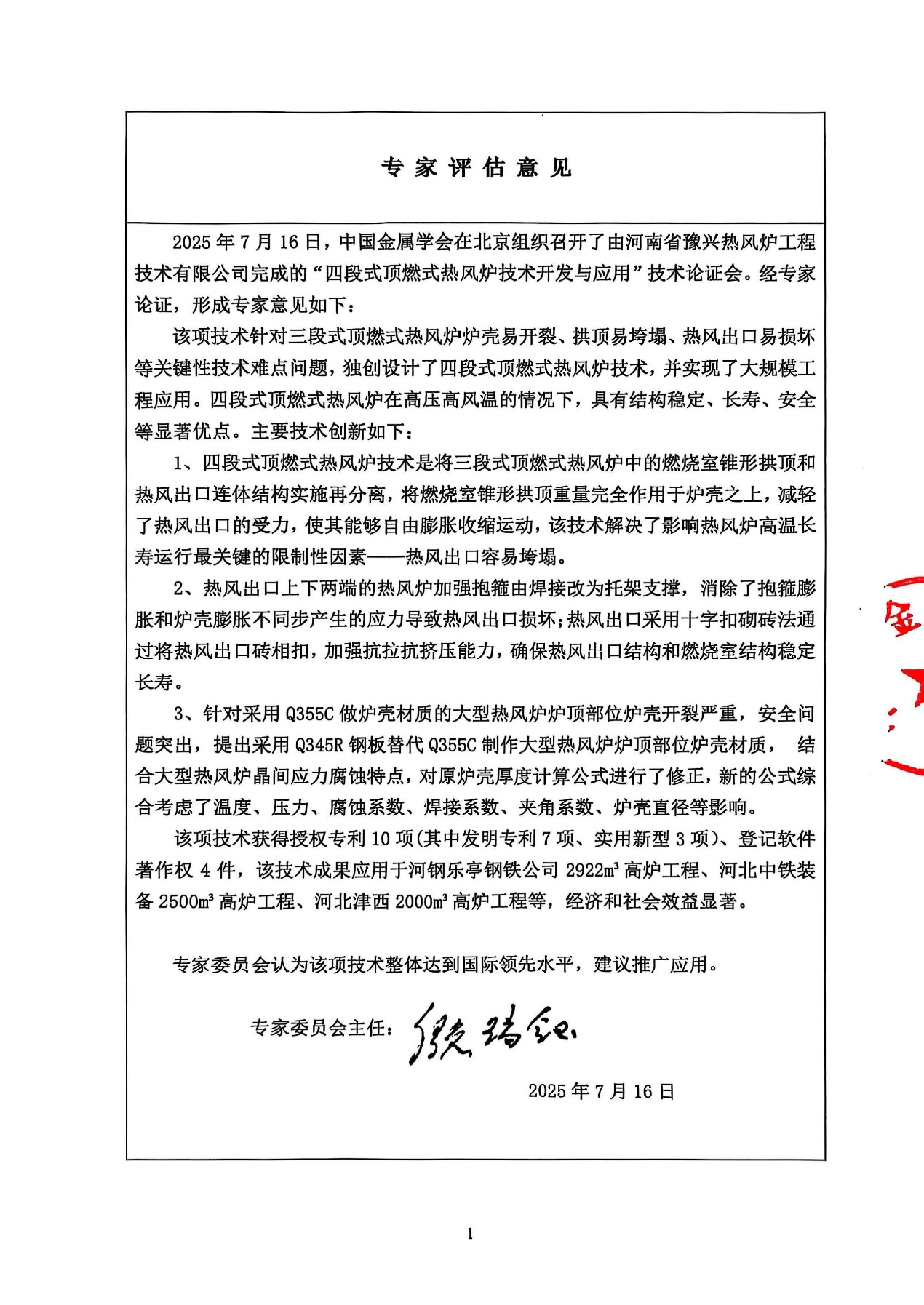 2025年7月16日,中國金屬學會在北京組織召開技術論證會,對河南省豫興熱風爐工程技術有限公司(下文簡稱豫興公司)完成的,“懸鏈線頂燃式熱風爐-無爆燃短焰燃燒技術開發與應用”、“四段式頂燃式熱風爐技術開發與應用”,以及“外燃式熱風爐改造為頂燃式熱風爐技術開發與應用”這三項成果進行評審,并展開深入論證。專家們得出的一致結論是:這三項豫興頂燃式熱風爐技術推廣前景廣闊!